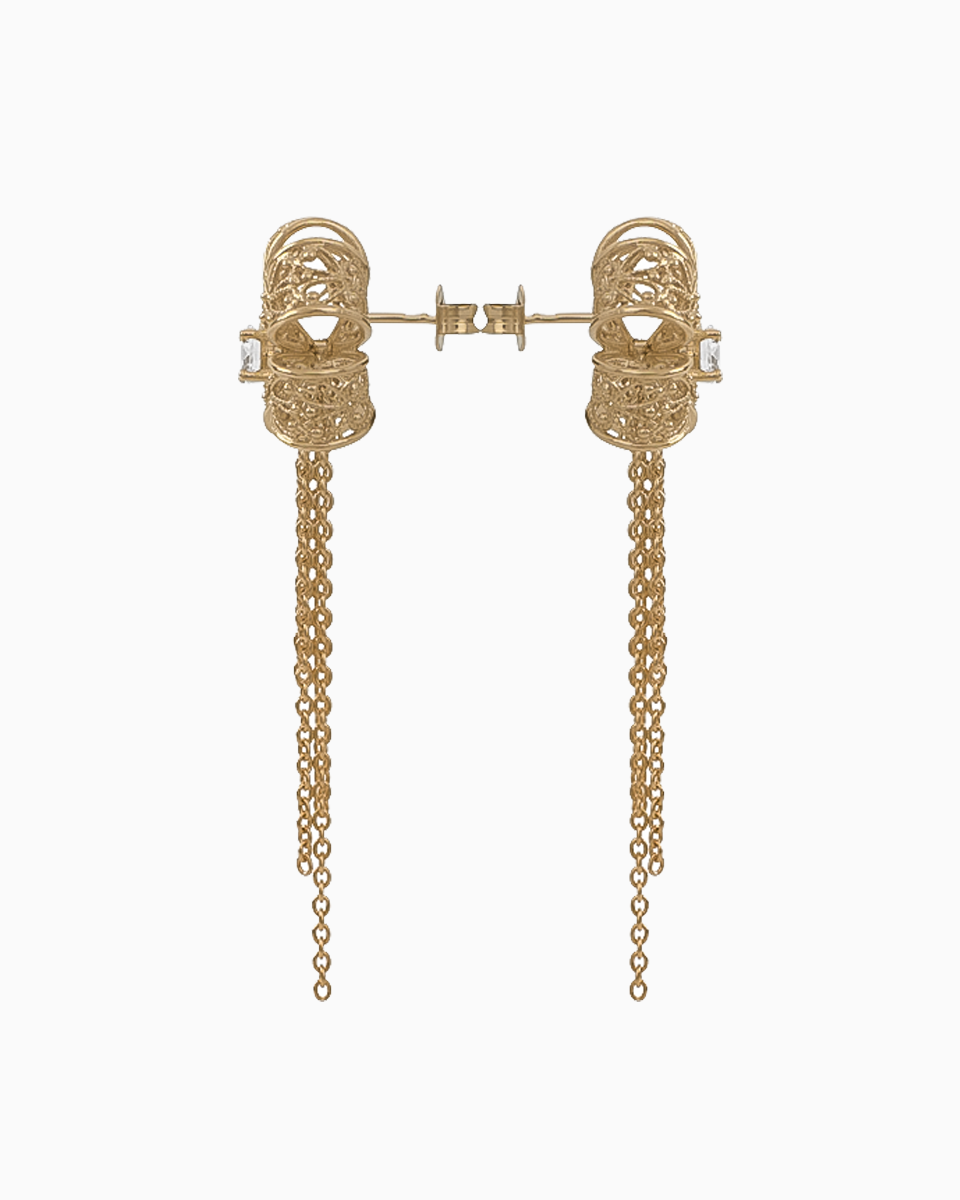 As correntes alongadas criam movimento e um toque de sofisticação, tornando esta peça perfeita para valorizar visuais elegantes e distintos. Uma escolha ideal para cerimónias, eventos especiais ou para quem deseja afirmar o seu estilo com requinte.