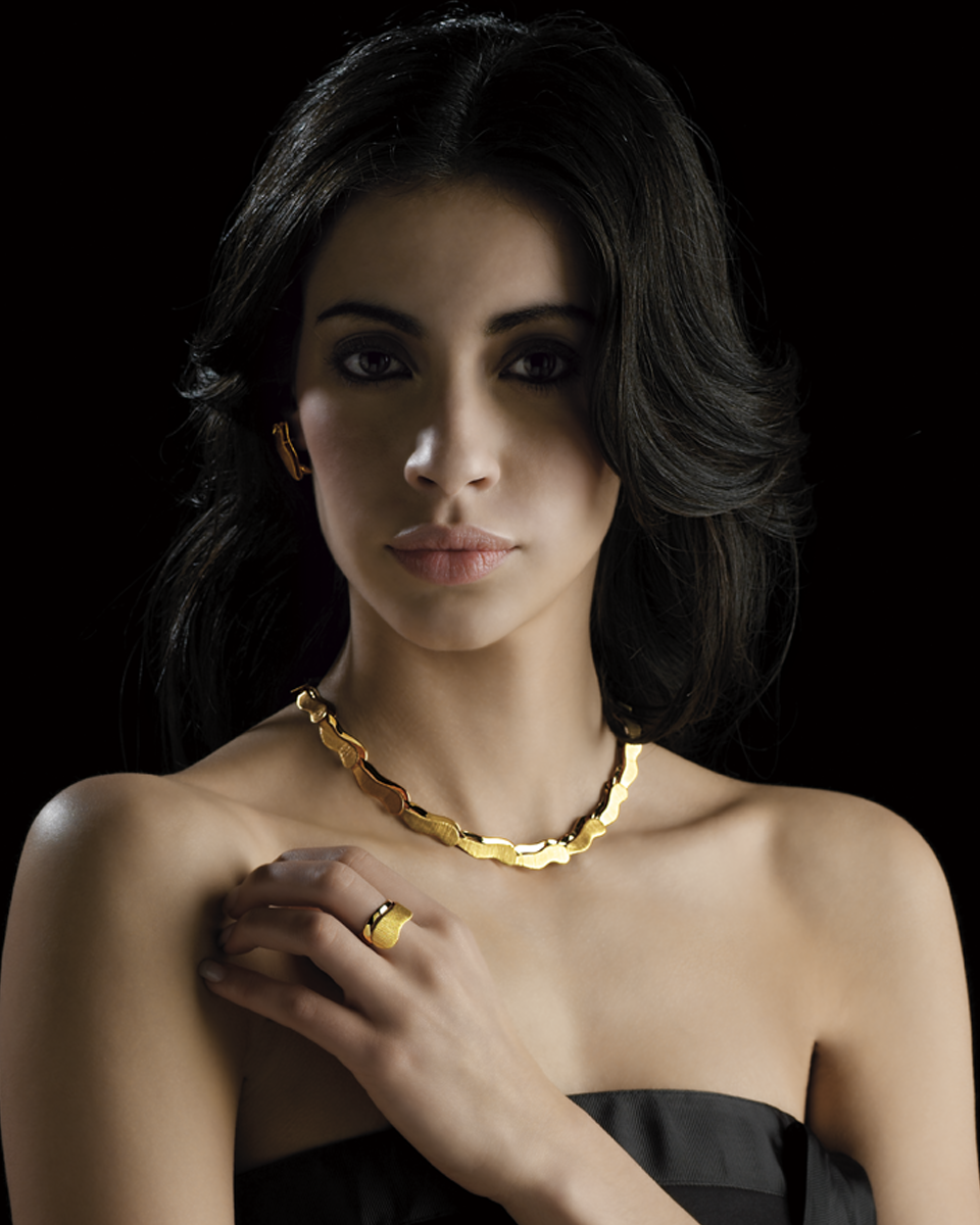 Inspirado nas formas onduladas do mar, este colar é composto por módulos interligados que criam movimento e harmonia ao redor do pescoço. O contraste entre os acabamentos foscos e polidos realça o dinamismo do design, conferindo-lhe um aspeto sofisticado e moderno.