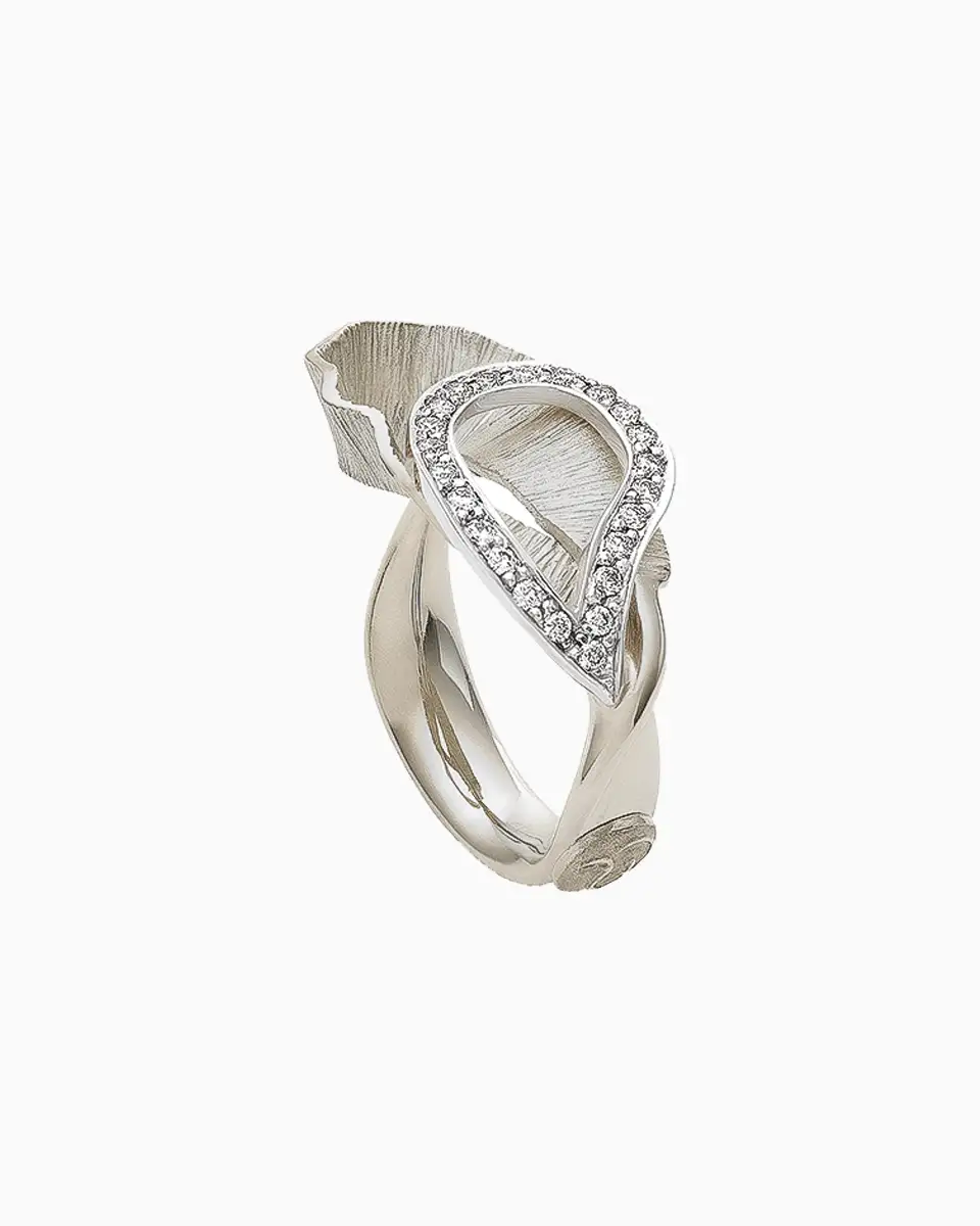 Anel Flor do Jarro em Ouro 19,2Kt — peça exclusiva da coleção Pedro Alves, criada em ouro amarelo e ouro branco com 23 diamantes cravados, jóia inspirada na delicadeza da flor do jarro.