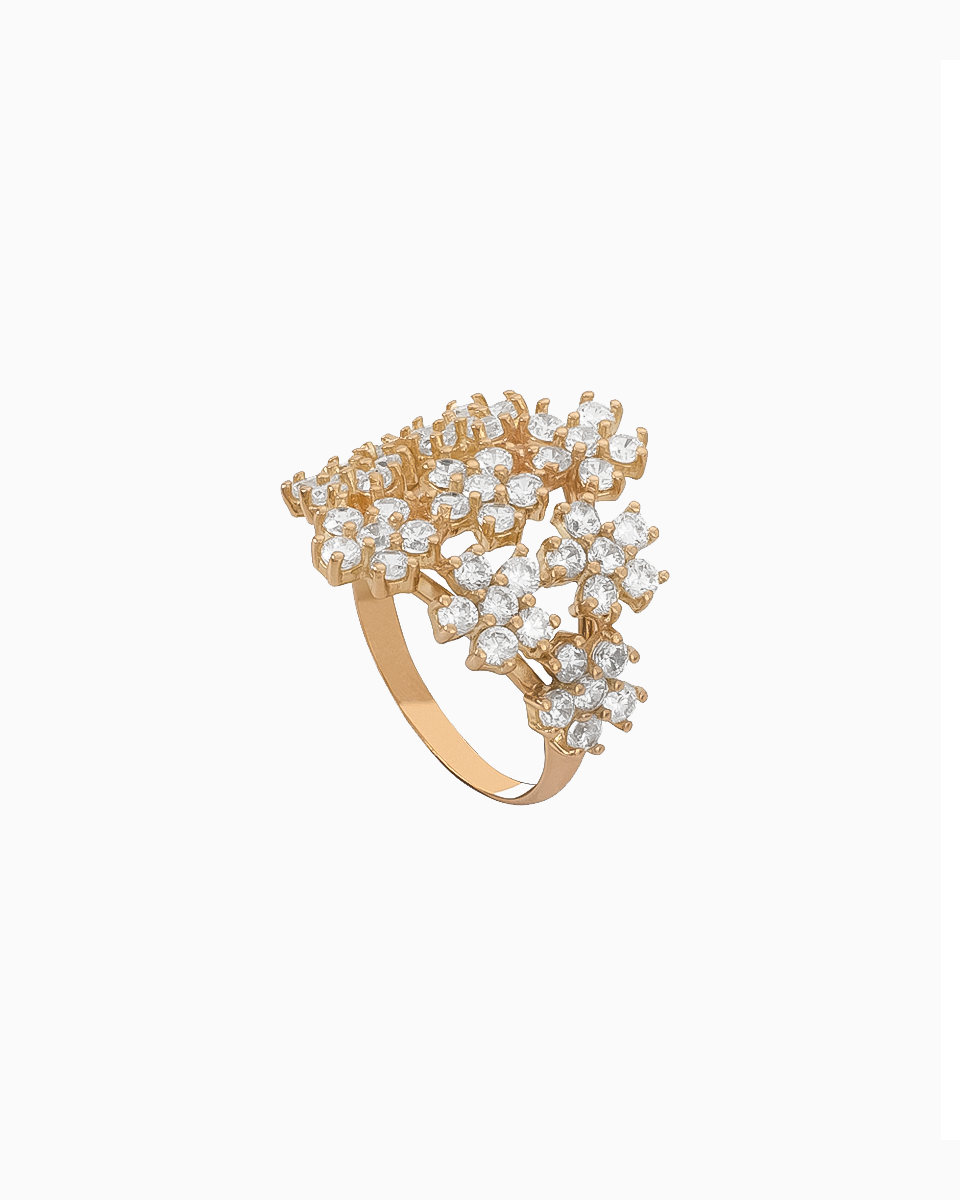 Anel Flores Ouro 19,2Kt com Zircónias — uma jóia artesanal portuguesa de luxo, com design floral luminoso que combina sofisticação e tradição.