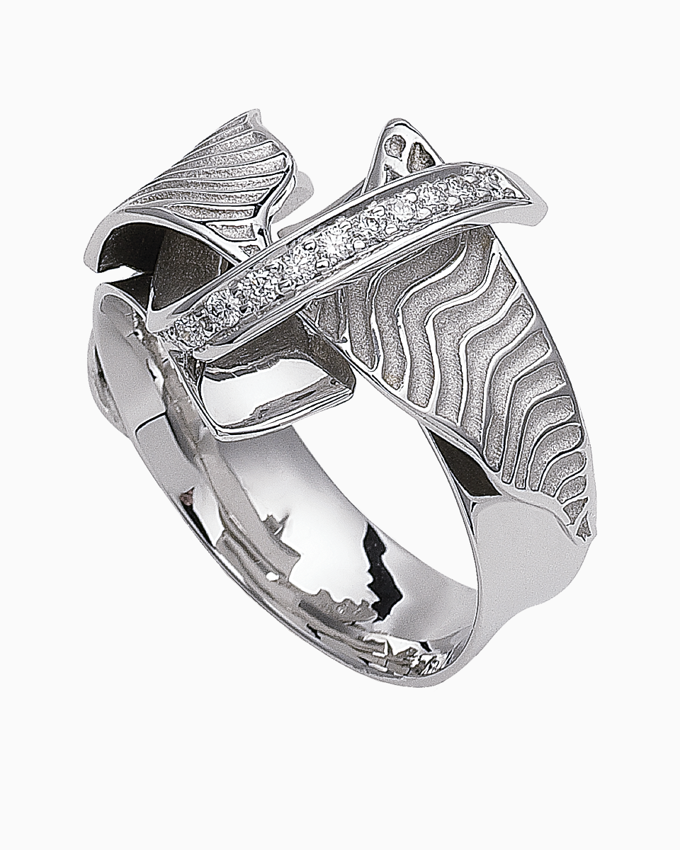 Anel em Ouro Branco 19,2Kt com 10 diamantes cravados, inspirado nas formas das correntes marítimas, joia exclusiva da coleção Pedro Alves.