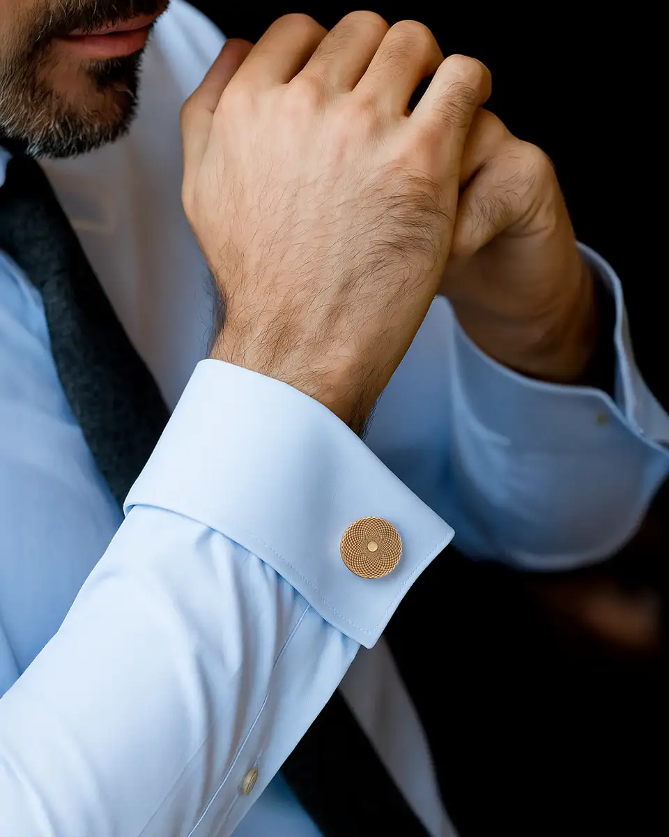 Leves e sofisticados, são perfeitos para acompanhar fatos e camisas sociais, acrescentando um toque elegante a ocasiões especiais, reuniões de prestígio ou celebrações formais. O design circular, trabalhado com minúcia, destaca-se pela sua singularidade, tornando cada peça num símbolo de estilo e exclusividade.