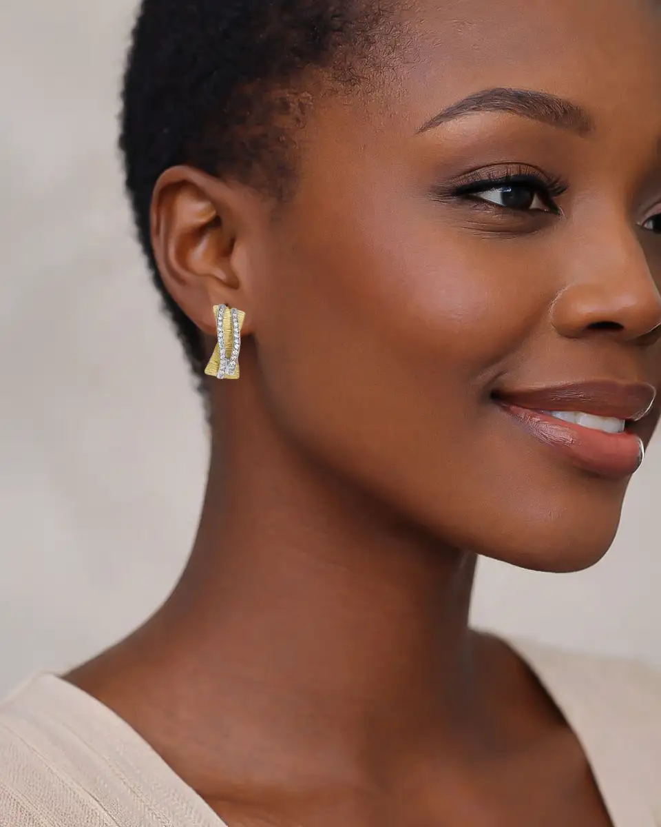 Brincos em Ouro Amarelo 19,2Kt com friso em Ouro Branco e cravação de 92 diamantes, joia exclusiva da coleção Pedro Alves.