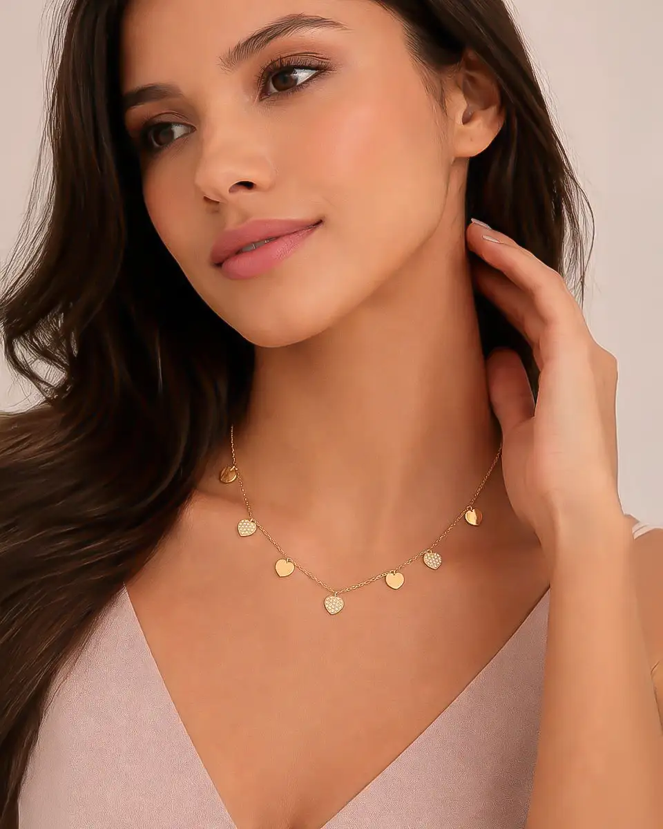 Design: Colar com 7 corações intercalados, lisos e cravados com zircónias