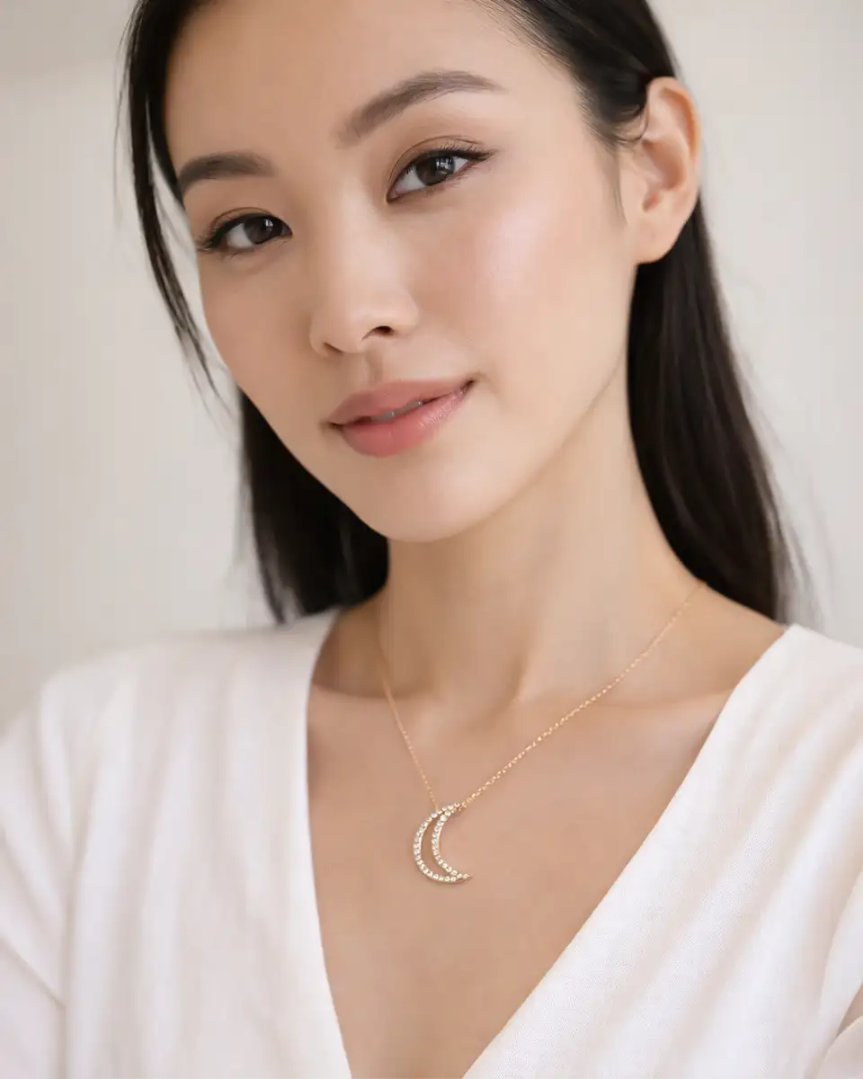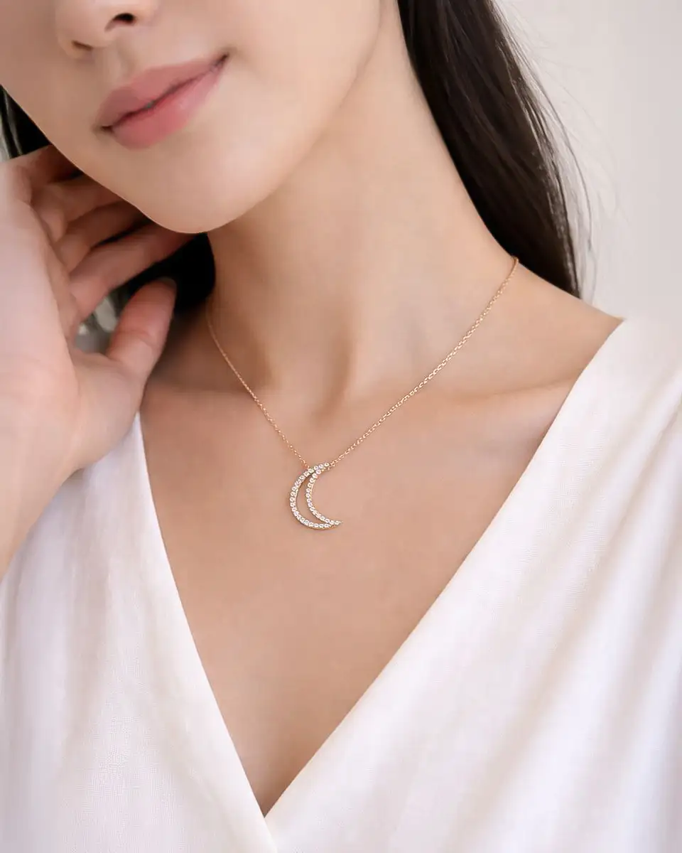 Colar Lua Crescente Prata 925 com Zircónias — uma jóia delicada e simbólica, que transmite elegância e charme, também disponível em Prata Dourada.