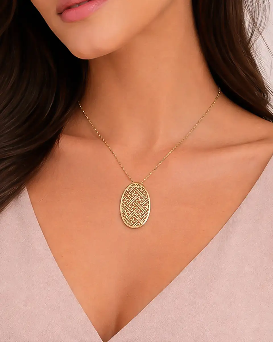 A medalha do colar apresenta uma forma côncava e oval, onde o padrão labiríntico ocupa o centro, destacando-se pela minúcia do trabalho artesanal. A malha 1×1 da corrente, com o seu padrão simples, valoriza e realça o belíssimo medalhão em ouro.
